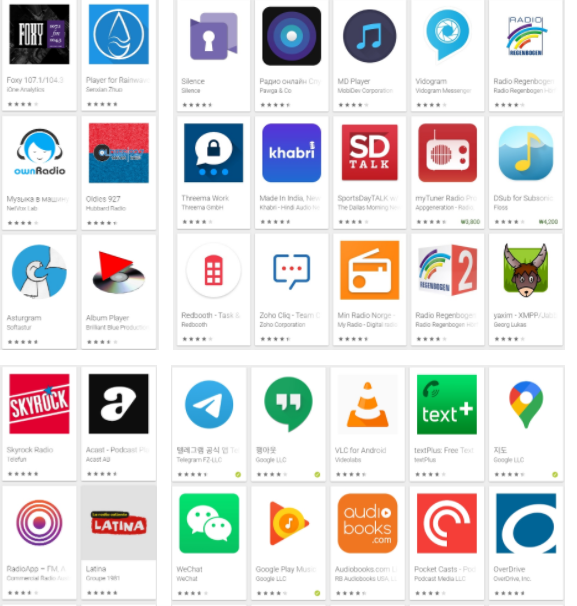 2020년 7월 현재 지니뮤직, 멜로, 카카오내비, 네이버뮤직, 벅스, 유튜브 뮤직 등 1000여 가지 앱이 안드로이드 오토 UI를 지원하고 있습니다.