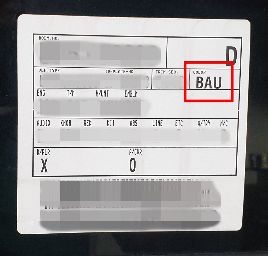 대부분의 차량은 차대번호 스티커에 색상정보가 표시되어 있습니다.