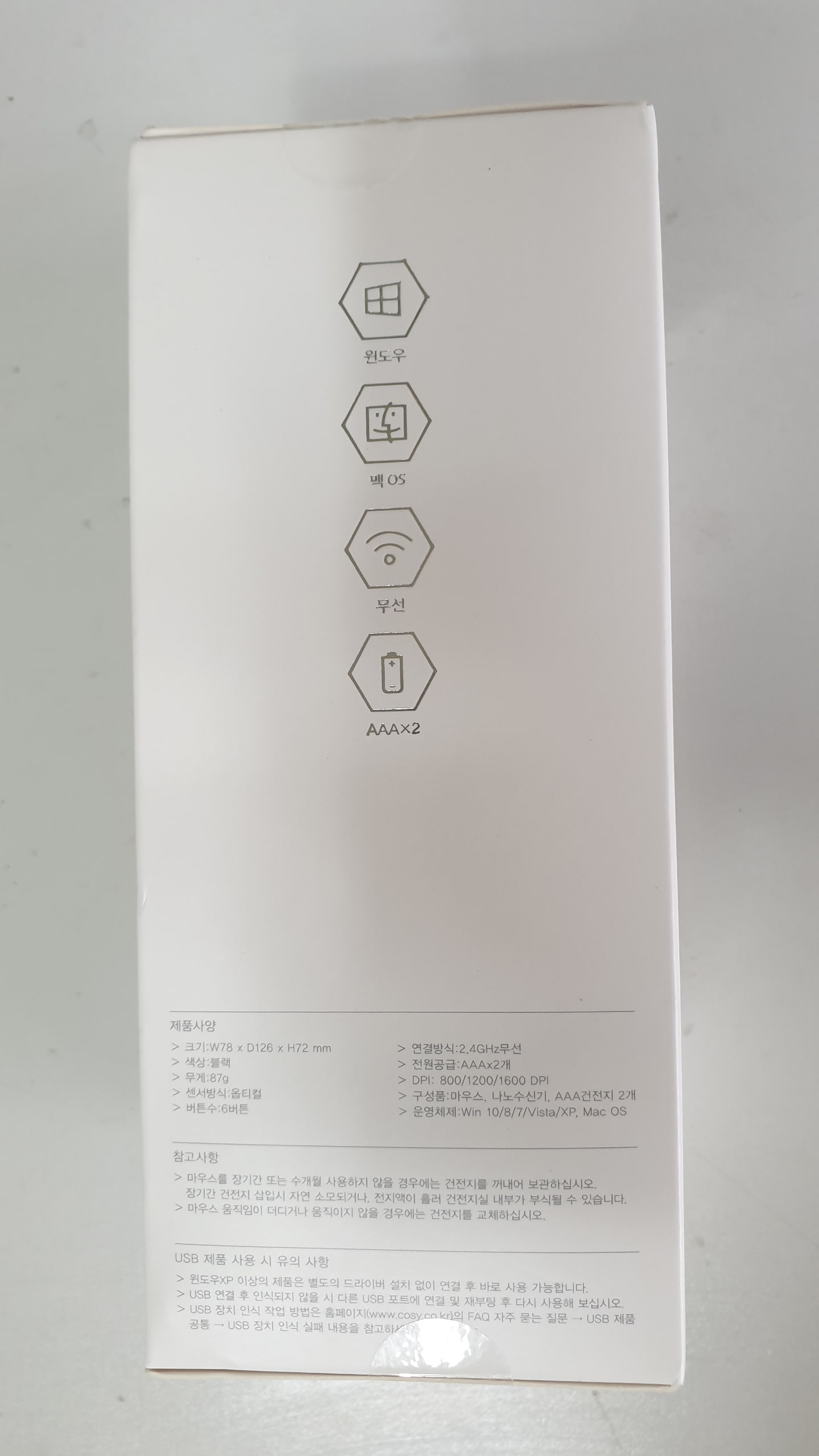 사진에서 보시는 것처럼 박스를 벗기면 투명 플라스틱 케이스에 마우스 본체, AAA 건전지, USB 수신기가 들어있습니다.