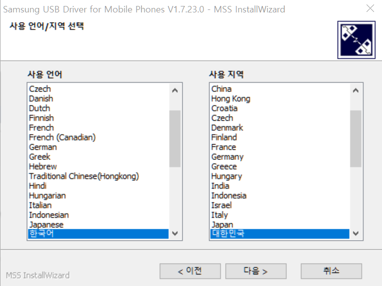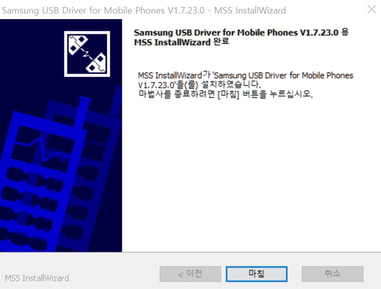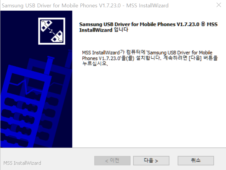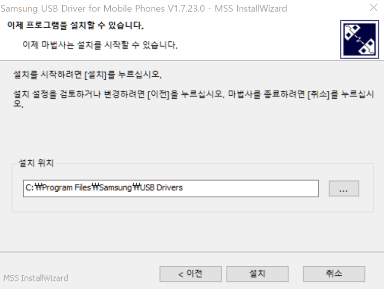 만약 PC에 삼성 USB 드라이버가 없다면 설치하라고 나옵니다.