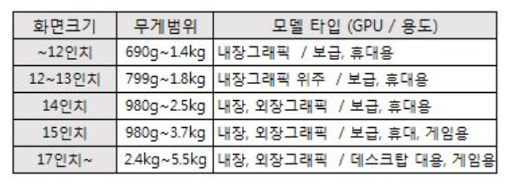 위 표처럼 일반적으로 화면이 클수록 무게는 전체적으로 증가하기 마련이며 이는 휴대성과 모델별 성능 구성에 연관성이 있습니다.