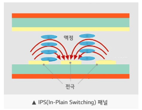 IPS 패널은 수평 배향성 액정을 사용하는 방식입니다. 액정이 전극 사이에 일정한 간격으로 수평 배열되어 있어, 시야각이 좋은 것이 특징입니다.