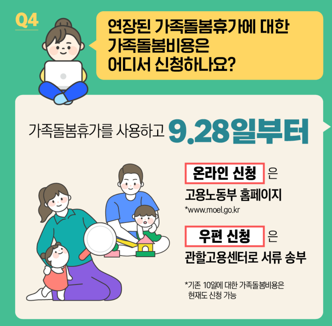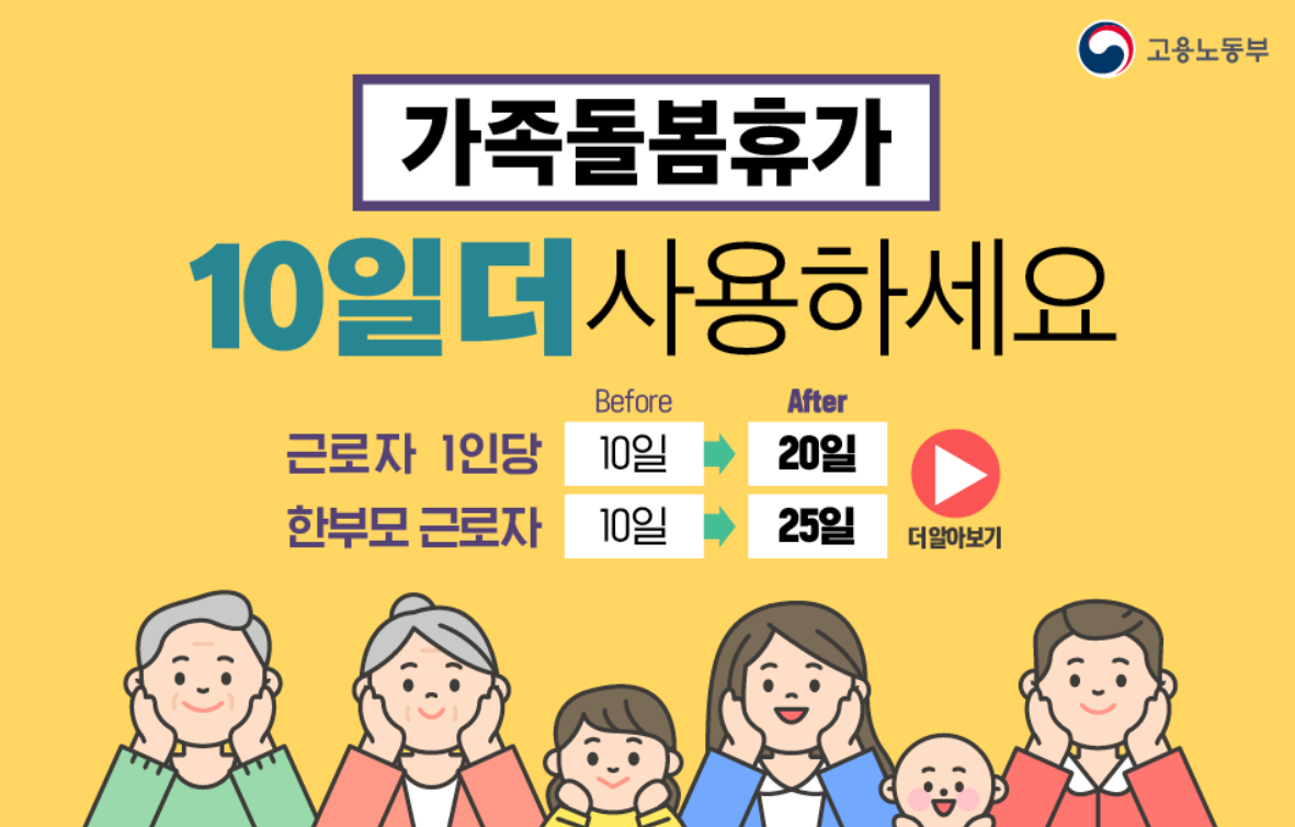 학교 휴교 및 어린이집 휴원 장기화에 따라 근로자의 자녀돌봄 수요 또한 증가하면서 가족돌봄휴가 사용 기간을 최대 10일 -> 20일로 연장하고 사용 기간 연장에 따라 정부의 가족돌봄비용 지원 기간 또한 최대 10일 -> 15일로 연장합니다.