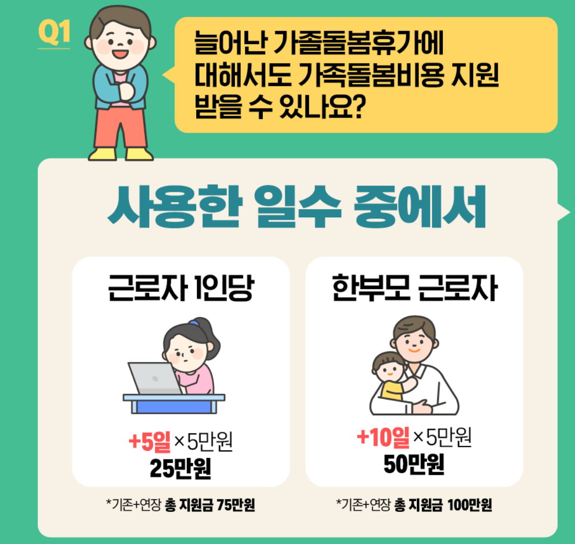 이에 따라 1인 근로자일 경우 최대 75만원까지, 맞벌이 부부일 경우 최대 150만원 까지 추가 지원이 가능해집니다.