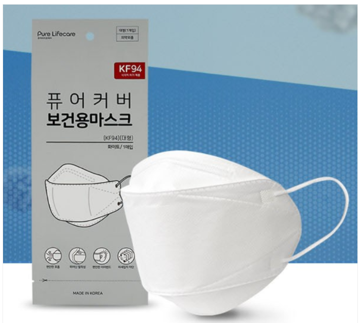 KF94 마스크는 황사, 미세먼지 뿐 아니라 전염질병에 대한 방역마스코로 KF80보다 차단효과가 높습니다.