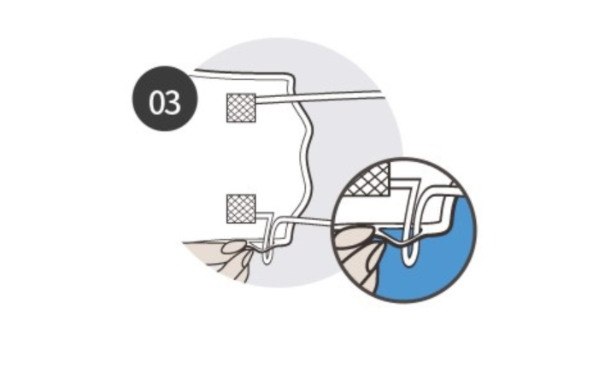 끈을 넣은 후 바깥쪽으로 당겨서 밀착시킨다.