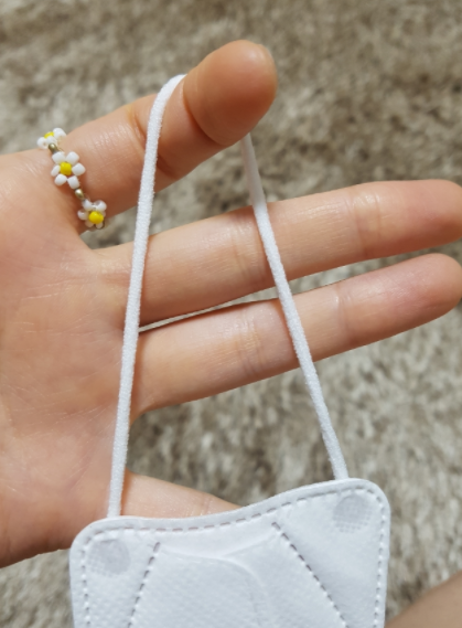 마스크 착용 후 돌출된 끈을 잡아당겨 끈의 길이를 조절한다.