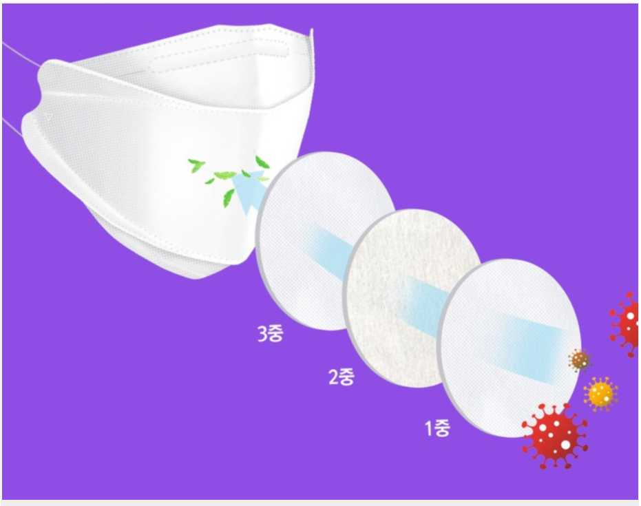 폴리프로필렌과 멜트블로운 소재를 혼합한(SMS) 외피와 부직포 소재를 사용한 안감을 겹쳐서 만든 2중 구조로 미세먼지 및 병균 강력 차단
