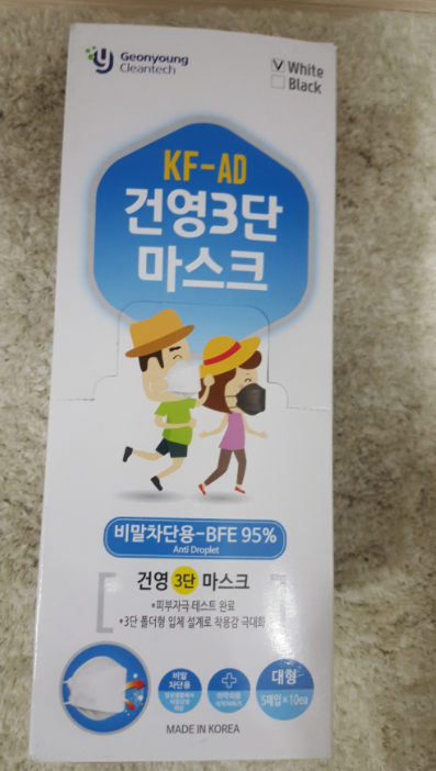건영 3단 마스크 KF-AD는 세균 여과효율 BRD 95%, 미세입자 55~80% 차단하며, 2중 필터 구조로 일상생활에 비말감염을 예방하고 통풍성이 좋아 숨쉬기 편합니다.