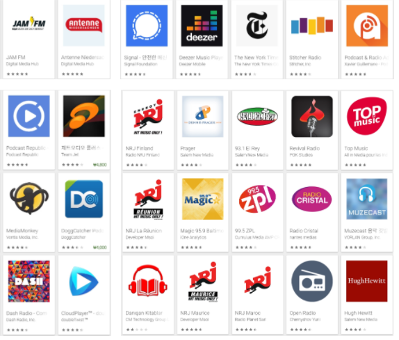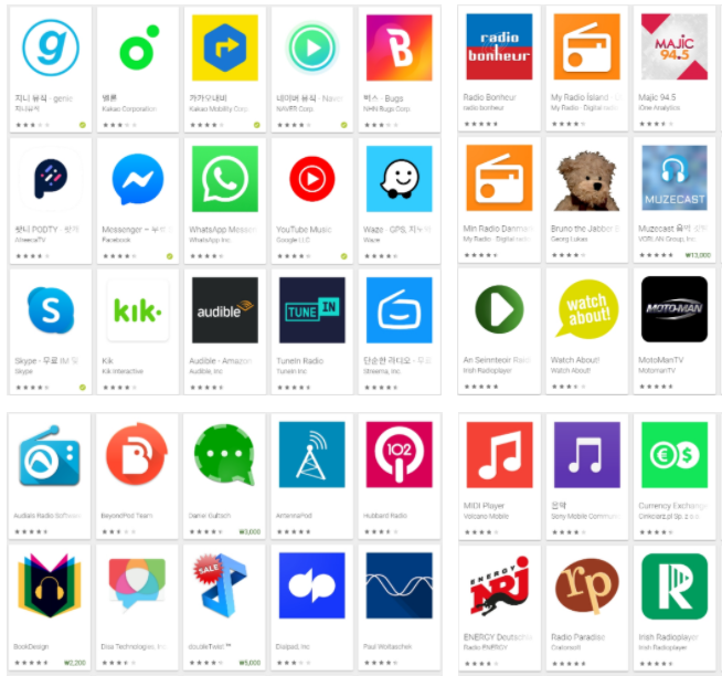 2020년 7월 현재 지니뮤직, 멜로, 카카오내비, 네이버뮤직, 벅스, 유튜브 뮤직 등 1000여 가지 앱이 안드로이드 오토 UI를 지원하고 있습니다.