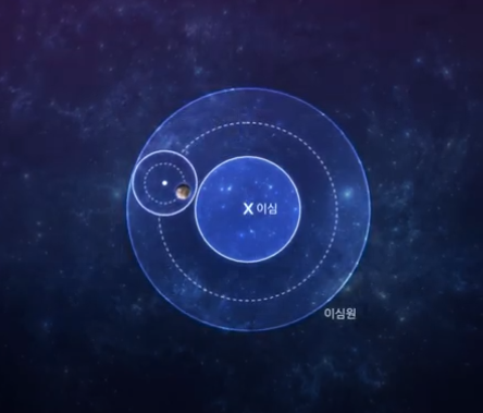 이 체계의 중심은 X, 즉 이심이며 지구는 중심에서 벗어나 있습니다. 이는 지구에서 바라본 행성들의 운동이 천구상에서 일정하지 않기 때문이었습니다.