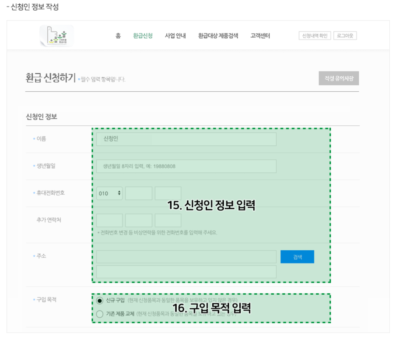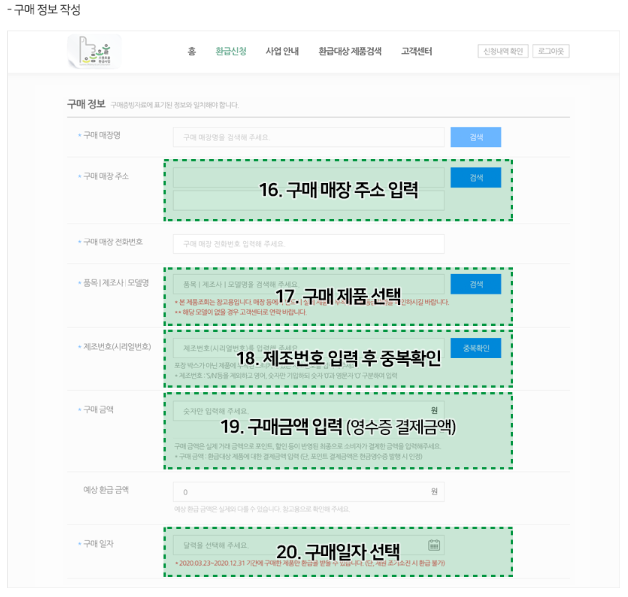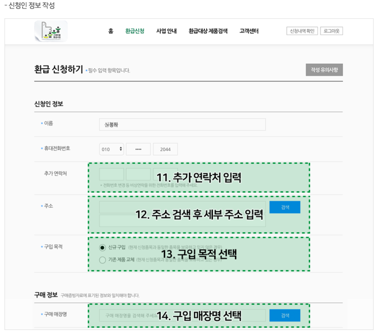 | 환급신청 | - 신청인 휴대폰 인증 - 개인정보 수집 및 이용 동의 - 주소입력 - 구입목적 입력 |