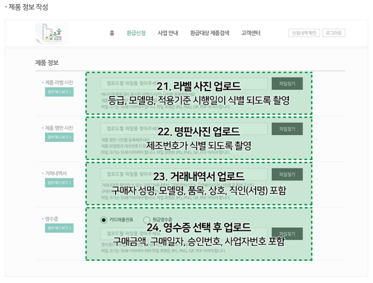 | 서류업로드 | 기본 서류 - 거래내역서 - 구매영수증 - 효율등급 라벨 사진 - 제조번호 명판 사진 |