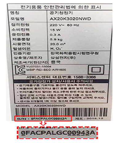 | 3단계 | 1. 제품 일련번호(제조번호) 입력 - 'S/N' 제회하고 기입 - 숫자 '0', 'Ø'과 알파벳'O' 구분하여 기입 2. 제조번호가 포함된 명판사진 업로드 * 명판사진에 제품 일련번호(제조번호)가 없을 경우, 제품 일련번호(제조번호) 사진을 업로드 ![]() |