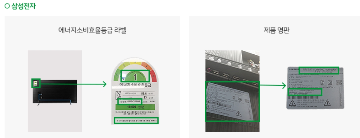 | 2단계 | 1. 구매정보 입력 - 품목, 모델면(라벨 모델명), 구매일자, 구매금액, 구매처 *에너지소비효율등급 라벨의 모델명 기입 2. 구매증빙서류 업로드(4종) - 거래내역서, 영수증, 에너지소비효율등급 라벨사진, 명판사진 * 거래증빙서류의 모델명은 에너지소비효율 등급 라벨의 모델명과 동일 |