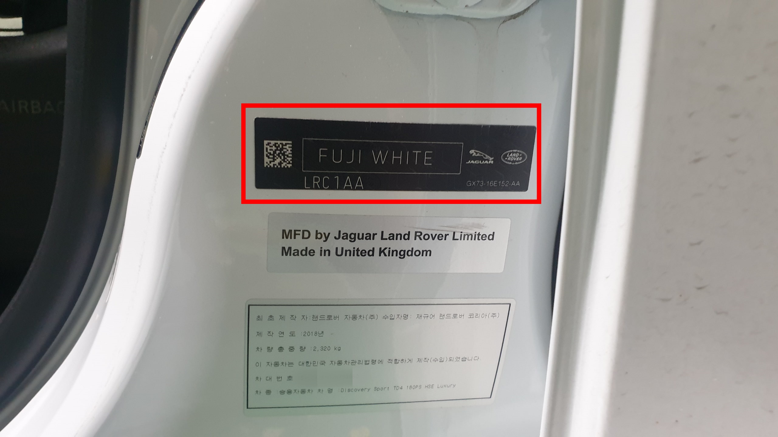 랜드로버 색상코드는 운전석 앞문을 열면 보이는 색상코드 스티커에 있습니다.