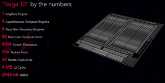 내부 구성은 1개의 그래픽 엔진 (Graphics Engine)과 4개의 비동기 컴퓨트 엔진 (Asynchronous Compute Engine), 4개의 차세대 지오메트리 엔진 (Geometry Engine), 64개의 차세대 컴퓨트 엔진 (Compute Units), 4096SP (Stream Processors), 256 텍스처 유닛 (Texture Units), 64 ROPs (Render Back-Ends), 4MB L2 캐쉬, 2048bit HBM2 메모리 인터페이스를 제공합니다.