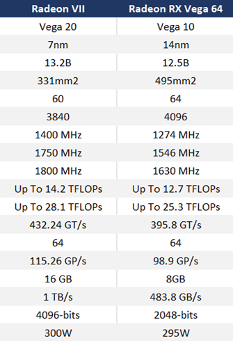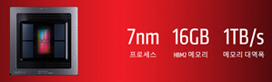‘라데온 VII’은 최대 1,750MHz에서 구동되는 60개의 컴퓨팅 유닛과 3,840개의 스트림 프로세서, 16GB HBM2 메모리와 1TB/s 메모리 대역폭, 4,096비트 메모리 인터페이스를 가집니다.