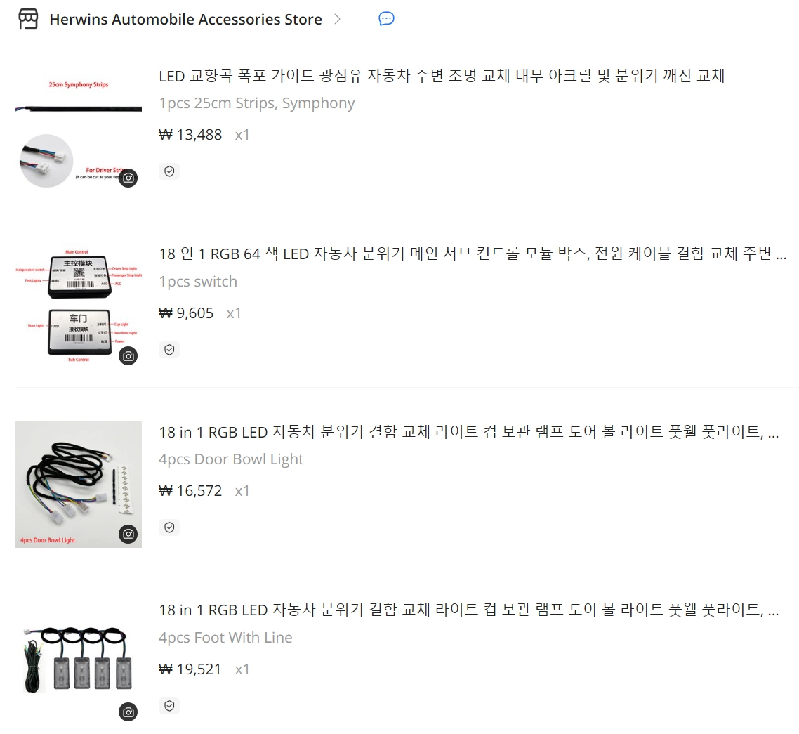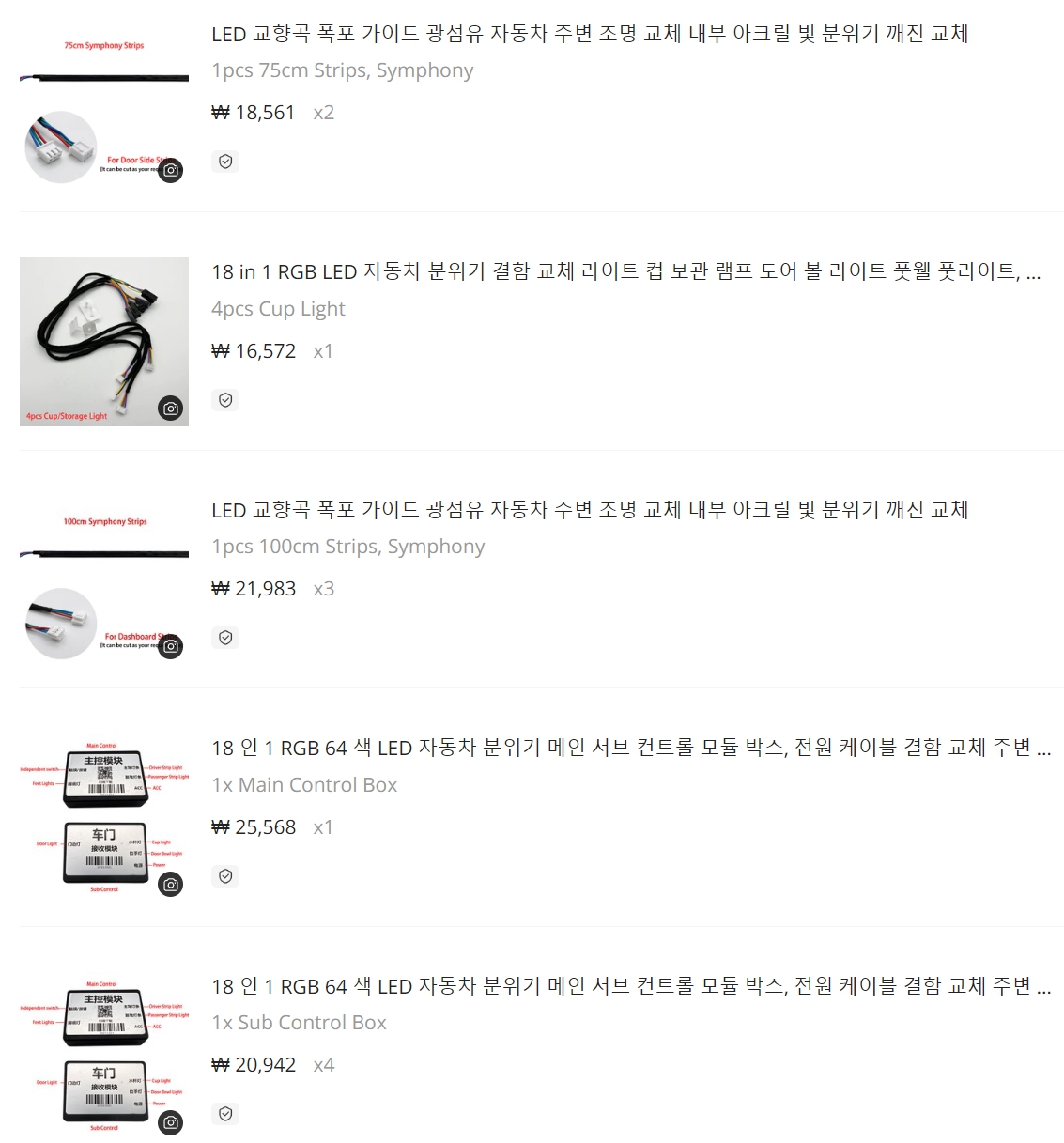메인 컨트롤 1ea, 도어 콘트롤 4ea, 100cm LED 스트립 3ea(조수석 대쉬보드, 앞문 2개), 75cm LED 스트립 2개(뒷문 2개), 25cm LED 스트립 1개(운전석 대시보드), 도어캐치 라이트 세트, 도어 컵홀더 라이트 세트, 풋 라이트 세트입니다.