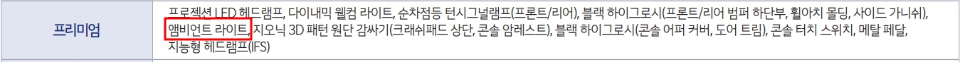 순정 앰비언트 라이트는 대쉬보드, 센터 콘솔(기어 셀렉트 있는 곳), 도어 포켓에 불이 들어옵니다. 일부 튜닝 샵에서 순정부품을 이용한 앰비언트 라이트 설치가 있긴 하지만 비용이 상당히 비쌉니다. 그리고 순정부품은 아니지만 LED를 이용한 앰비언트 라이트 설치 패키지도 있습니다. 이것 또한 60~80만원 정도 하는 것으로 알고 있습니다.