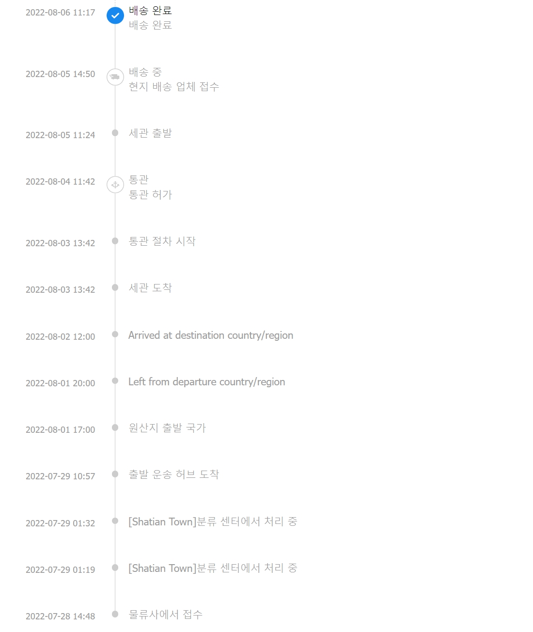 7월 27일 주문, 8월 6일 배송 완료로 2주 정도 소요되었습니다.