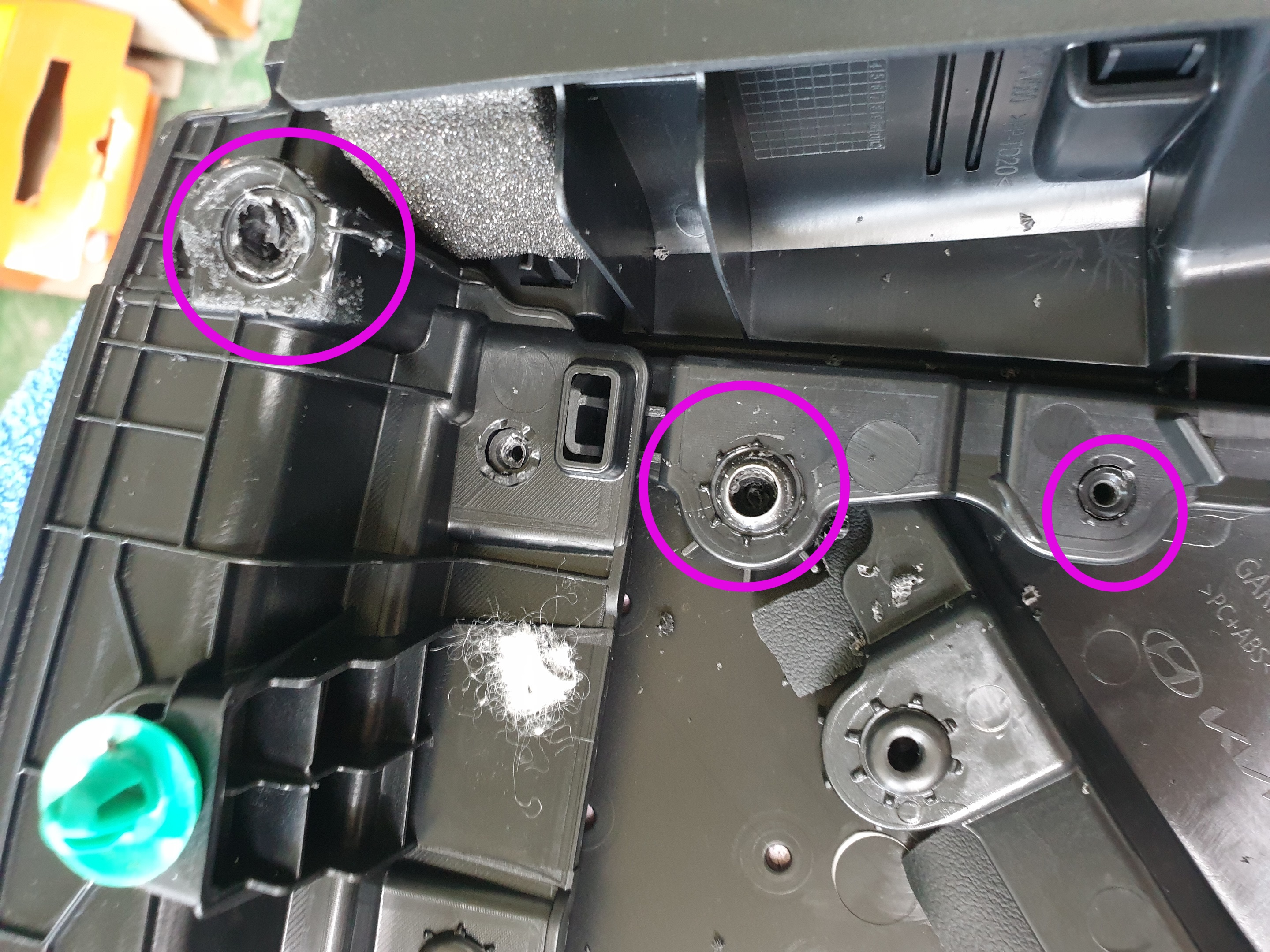 하이그로시를 탈거한 후 오디오/공조기 패널을 분리합니다. 위 사진의 동그라미 부분에 나사가 세 군데 있습니다. 모두 풀고 가슴 쪽으로 강하게 당겨 줍니다. 처음에 잘 빠지지 않습니다... 역시나 과감히...